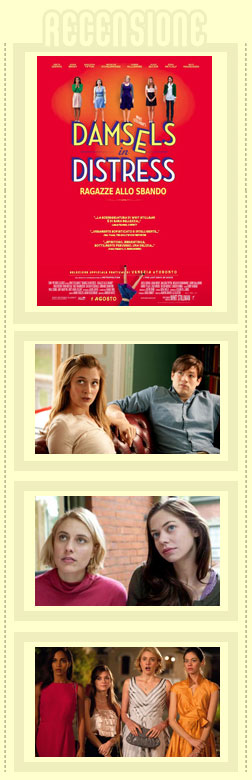 Damsels in distress recensione] - Non particolarmente dotato di sense of humour, il cinema americano è capace tuttavia di insolite e dissimulate critiche alla società che lo ispira. Nel caso di "Damsels in distress", bersaglio delle risate caustiche del regista Whit Stillman è il mondo post-teen dei college, calderone di miti e di stereotipi, tritacarne che cerca di tradurre la confusione adolescenziale in qualcosa di simile al Sogno Americano. Nell'East Coast College, il trio ipercompetitivo e complessato composto da Violet, Rose e Heather cerca di imporre alle altre studentesse una pretenziosa e sgangherata dittatura sulle abitudini personali, il dress code, l'etichetta, nel tentativo di salvare le matricole dalla barbarie dilagante del dormitorio maschile e sventare così potenziali suicidi. L'arrivo di Lily, appena trasferitasi all'East Coast da un altro ateneo, stravolge le convinzioni e i progetti del mitico trio. La nuova arrivata, equilibrata e scettica di fronte alle manie delle compagne, spinge Violet, Rose e Heather a rinnegare il loro dorato isolamento e a scendere a patti con la sana imperfezione del mondo che le circonda. Sesso, amore non corrisposto e dubbi esistenziali travolgono la debolezza patinata di queste "donzelle in crisi da stress" e le obbligano ad ammettere la propria balbettante immaturità. Il film di Stillman è una commediola frizzante farcita di battute demenziali e con musiche da videoclip sparate a un volume appena al di sopra del sopportabile. Però, nella sua disarmante semplicità, questa (s)mascherata caciarona e volgarotta che addita le fisime e le fragilità di tanti studenti di college, chiamati a conformarsi a un ideale di celluloide, lancia uno strale a una fetta di società americana malata di perfezionismo. E centra bene il bersaglio.