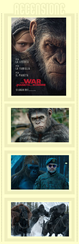 The War Il pianeta delle scimmie recensione] - Avevamo lasciato Cesare che nonostante gli sforzi non riusciva, per un pelo, ad evitare la guerra con gli umani e lo ritroviamo un po' incanutito, asserragliato nella foresta a guidare la resistenza dei primati contro i continui assalti dell'esercito capitanato dall'invasato e fascistoide colonnello Woody Harrelson. Per cui, se guerra deve essere e guerra sia (del resto è dal 1968 che sappiamo come va a finire). The war – il pianeta delle scimmie, terzo episodio della saga-prequel iniziata nel 2011 che, forse a sorpresa e abbastanza in sordina, si sta rivelando una delle saghe più meritorie degli ultimi 10 anni. Merito soprattutto del regista, Matt Reeves, che dal secondo capitolo, ha saputo infondere alla storia un carattere più maturo, più cupo e più intenso anche rispetto a quelli che potevano essere gli intenti degli inizi. Riallacciandosi direttamente ad Apes revolution, mantenendo la medesima coerenza di stile e di contenuti, Reeves è bravo ancora una volta a rispettare l'esigenza di spettacolarità e svago insita nel dna del blockbuster senza rinunciare all'impegno e alla riflessione di un'opera autoriale priva di piaggerie al limite della crudeltà, ricca di citazioni e rimandi alla storia, all'attualità, al cinema, metafora della condizione umana, capace di mantenere per 2 ore e venti di durata una tensione, drammatica e drammaturgica, elevata e costante. Ancor più sorprendente se si pensa che in questo The war l'apporto umano è ridotto ai minimi termini (praticamente l'unico attore in carne ed ossa è Woody Harrelson), mentre le scimmie create a computer in motion capture, se la cavano più che bene a reggere da sole tutto il peso della sceneggiatura, tra dialoghi, sguardi, espressioni e primi piani. Se ogni personaggio gode di un' ottima caratterizzazione, grazie alla quale entra immediatamente in empatia con l'audience, l'eroe indiscusso della vicenda è e resta, ça va sans dire, Cesare, perfetta incarnazione del carisma del capo, condottiero magnanimo e coraggioso, simbolo della dignità quale strumento di rivalsa dei deboli e degli oppressi che nonostante la loro subalternità non intendono piegare la testa difronte ai soprusi e alle ingiustizie del mondo, lui sì umano troppo umano, perseguitato dagli incubi e dai sensi di colpa, al punto da venire anch'egli corrotto nell'animo dalla sete di vendetta che pur giustificabile non può permettersi di obnubilare la mente di uno spirito eletto. Nell'evidente parallelismo biblico sarà lui il novello Mosè che dovrà liberare il suo popolo dalla schiavitù e, attraverso il deserto, condurlo fino alla terra promessa.